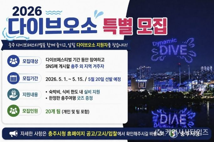 (케이시사타임즈) 충주시가 ‘2026 충주 다이브 페스티벌 with MyK FESTA’을 맞아 지역 관광의 매력을 널리 알릴 특별 홍보단 ‘다이브 오소(O-SO) 충주’ 참여자를 모집한다고 밝혔다.