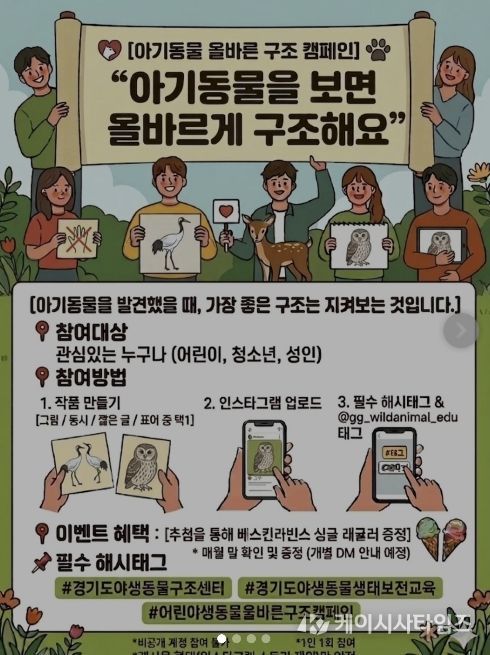 경기도는 어린이를 대상으로 시행하는 ‘야생동물 생태보전교육’에서도 자칫 납치가 될 수 있는 야생동물 구조에 대한 내용을 교육하고 있다. 또 ‘아기동물을 보면 올바르게 구조해요’라는 캠페인을 병행해 미래 세대가 야생동물의 생태적 특성을 이해하고, 인위적 개입을 줄여 자연과 공존하는 삶을 영위할 수 있도록 지속적으로 노력하고 있다.