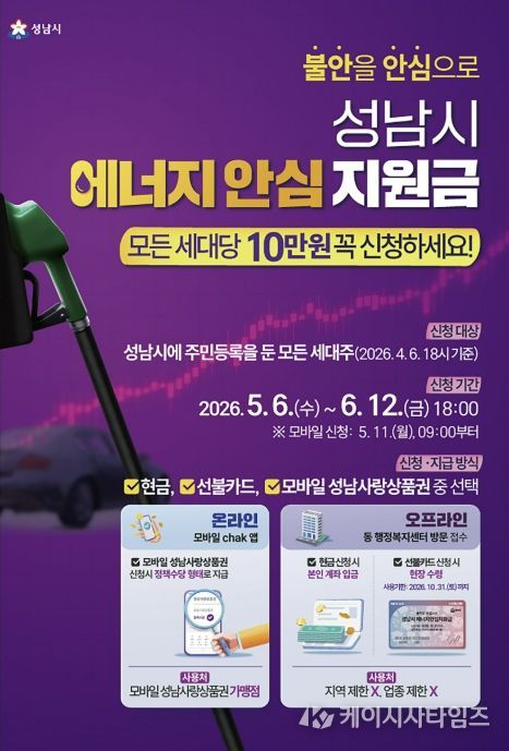 (케이시사타임즈) 성남시는 중동 사태에 따른 국가 자원안보 위기 경보 발령으로 경제적 부담이 커진 시민들을 지원하기 위해 전국 최초로 ‘성남시 에너지 안심지원금’을 오는 5월 6일부터 신청을 받는다고 밝혔다.