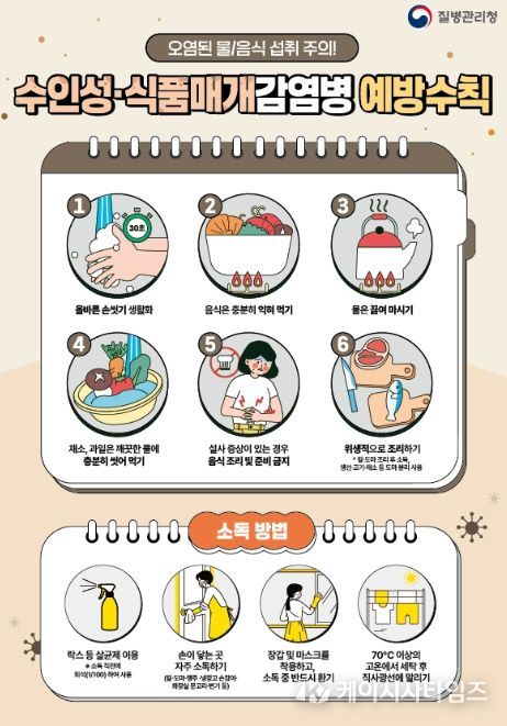 수인성ㆍ식품매개감염병은 병원성 세균, 바이러스, 원충에 오염된 물이나 식품을 섭취해 구토, 설사, 복통 등의 장관 증상을 유발한다. 이를 예방하기 위해서는 ▲올바른 손 씻기 생활화 ▲음식 충분히 익혀 먹기 ▲물 끓여 마시기 ▲채소ㆍ과일 깨끗한 물에 충분히 씻어 먹기 ▲설사 증상 시 음식 조리 및 준비 금지 ▲위생적으로 조리하기 등 예방수칙을 준수해야 한다.