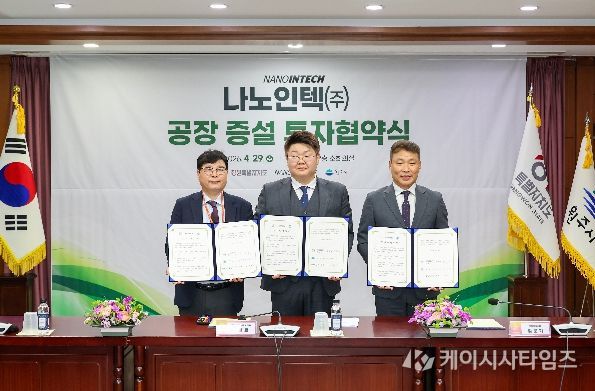 (케이시사타임즈) 원주시와 강원특별자치도는 지난 29일 김문기 원주시장 권한대행, 심원섭 강원특별자치도 산업국장, 박병호 나노인텍㈜ 대표이사 등이 참석한 가운데 나노인텍㈜ 공장 증설을 위한 투자협약을 체결했다.