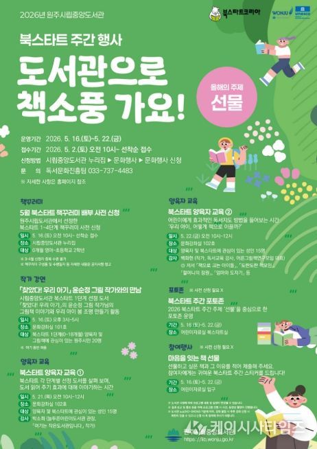 (케이시사타임즈) 원주시립중앙도서관은 독서문화 확산을 위해 다음 달 16일부터 22일까지 2026 북스타트 주간 행사 ‘도서관으로 책소풍 가요!’를 운영한다.