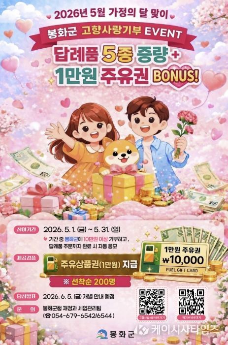 (케이시사타임즈) 봉화군은 5월 가정의 달을 맞이하여 고향사랑기부제 활성화를 위해 5월 1일부터 31일까지 1개월간 “답례품 UP ! 주유권 BONUS !”란 주제로 고향사랑기부제 경품 이벤트를 진행한다.