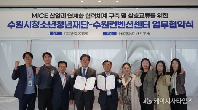 (케이시사타임즈) 수원시청소년청년재단(이사장 최종진)과 수원컨벤션센터가 4월 30일 양 기관의 상호 협력과 교류 확대를 위한 업무협약을 체결했다.