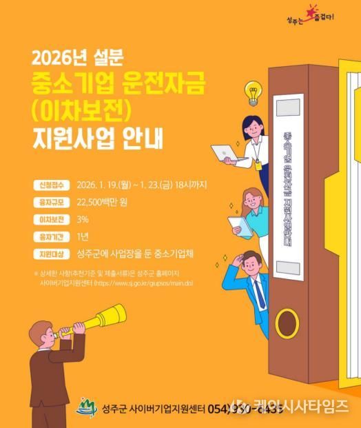 케이시사타임즈 관리자 기자 | 성주군은 설 명절을 앞두고 관내 중소기업의 자금 부담 완화를 위해 2026년도 중소기업 운전자금(이차보전) 설 명절분을 225억원 규모로 지원한다.