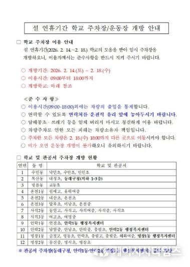 연휴 기간 동안 관공서 주차장은 종일 개방되며, 학교 주차장은 오전 9시부터 오후 6시까지 이용할 수 있다. 다만, 우천 시 운동장은 개방하지 않는다.