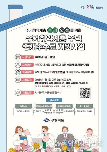 구비서류는 ▴수급자 증명서 또는 차상위계층 확인서 ▴주민등록등본 ▴매매·임대차 계약서 ▴중개수수료 영수증 ▴통장 사본 ▴개인정보 제공 동의서 등이며, 사업과 관련한 자세한 사항은 경상북도 누리집에서 확인할 수 있다.