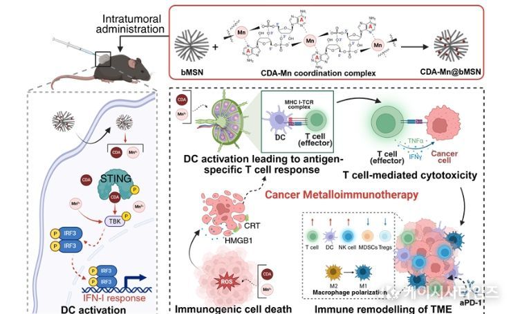 연구진은 이러한 문제를 해결하기 위해 망간 이온(Mn²⁺)과 CDN의 배위결합 복합체를 다공성 실리카 나노입자 내부 기공에 탑재해 망간 이온과 CDN이 활성 제약 성분으로 작용하는 나노-면역항암제를 개발했다.