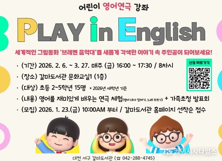 케이시사타임즈 관리자 기자 | 대전 서구 갈마도서관은 관내 2~5학년 초등학생을 대상으로 영어 연극 강좌‘Play in English’를 운영한다고 19일 전했다.