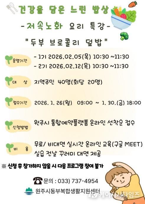 케이시사타임즈 관리자 기자 | 원주시 동부복합생활지원센터는 오는 26일부터 저속노화 요리 특강 ‘건강을 담은 느린 밥상’ 프로그램 참여자를 모집한다.