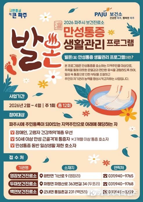 케이시사타임즈 관리자 기자 | 파주시 보건진료소는 보건의료 취약지역 주민들의 건강증진을 위해 2026년 ‘발온(溫) 만성통증 생활관리’교실을 운영한다.