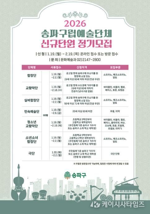 케이시사타임즈 관리자 기자 | 서울 송파구는 지역 문화예술 저변 확대와 구민의 문화 향유 기회 제공을 위해 오는 2월 19일까지 구립문화예술단체 신규단원을 공개 모집한다고 밝혔다.