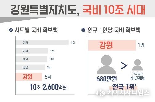 케이시사타임즈 관리자 기자 | 강원특별자치도는 국비 확보 10조 시대에 진입한 가운데, 인구 1인당 국비 확보액이 약 680만 원으로 전국 1위에 해당한다고 밝혔다.