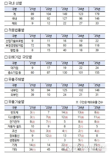 유출 기술별로는 ▵기계(15건, 8.3%) ▵디스플레이(11건, 6.1%) ▵반도체(8건, 4.5%) ▵정보통신(8건, 4.5%) ▵이차전지(8건, 4.5%) ▵생명공학(6건, 3.4%) ▵자동차·철도(5건, 2.8%) 등 순으로 나타났다.