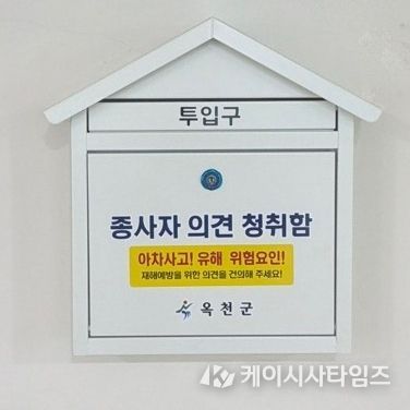케이시사타임즈 관리자 기자 | 옥천군은 종사자의 안전·보건을 보다 체계적으로 관리하고, 현장의 다양한 목소리를 폭넓게 수렴해 군정에 적극 반영하기 위해 군청 및 읍·면사무소 등 주요 공공시설 16개소에 총 21개의 종사자 의견청취함을 설치·운영한다고 밝혔다.