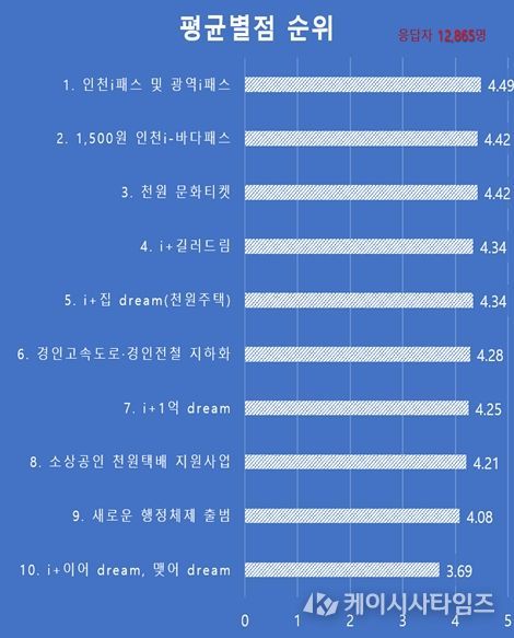 설문은 인천시가 추진 중인 10대 주요 사업에 대해 5점 만점의 별점 평가 방식으로 진행됐으며, 전반적으로 높은 점수를 받았다.