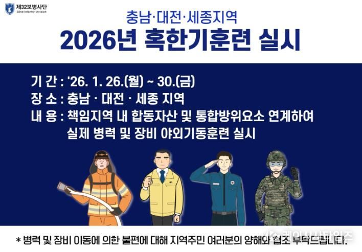 케이시사타임즈 관리자 기자 | 육군 제32보병사단은 오는 1월 26일부터 30일까지 충남ㆍ대전ㆍ세종 지역에서 동계 통합 방위 작전 확립을 위한 혹한기 훈련을 진행한다.