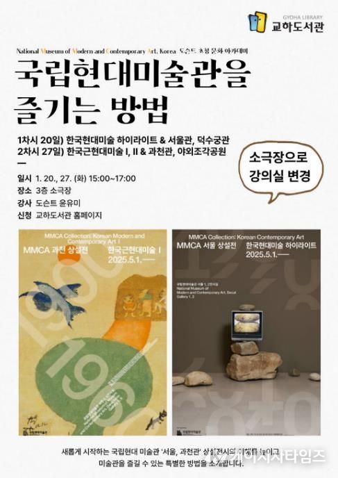 케이시사타임즈 관리자 기자 | 파주시 교하도서관은 오는 20일과 27일, 15시부터 17시까지 교하도서관 3층 소극장에서 전문 안내원(도슨트) 초청 강연 프로그램 ‘국립현대미술관을 즐기는 방법’을 운영한다.