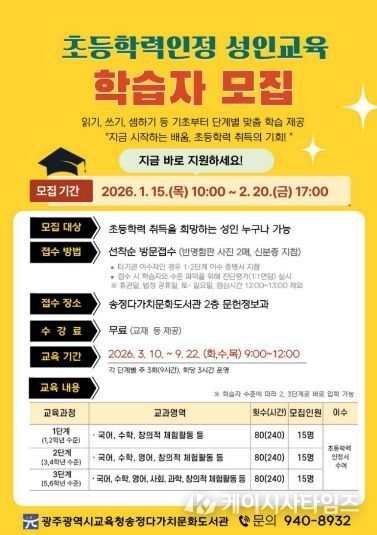 케이시사타임즈 관리자 기자 | 광주시교육청송정다가치문화도서관은 ‘2026학년도 초등학력인정 성인교육’ 프로그램을 운영한다.