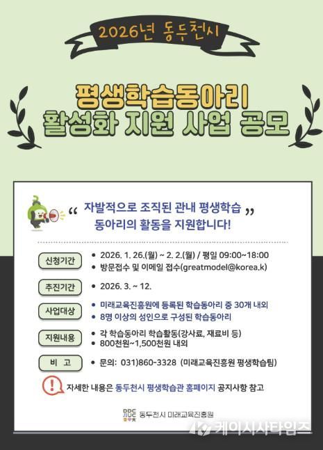 케이시사타임즈 관리자 기자 | 동두천시는 오는 1월 26일부터 2월 2일까지, 시민 주도형 평생학습 문화 확산을 위해 ‘2026년 평생학습 동아리 활성화 지원사업’에 참여할 학습동아리를 모집한다고 밝혔다.