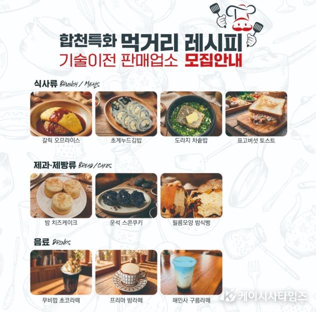 케이시사타임즈 관리자 기자 | 합천군은 지역 특산물을 활용한 차별화된 먹거리를 보급하고 관광객들에게 풍성한 미식 경험을 선사하기 위해 ‘합천특화 먹거리 레시피 기술이전 및 판매업소’를 2026년 1월 19일 월요일부터 2월 20일 금요일까지 모집한다고 밝혔다.