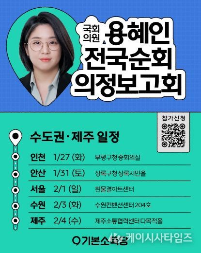 케이시사타임즈 관리자 기자 | 기본소득당 용혜인 의원이 오는 1월 27일부터 2월 3일까지 인천광역시, 경기 안산시, 서울특별시, 경기 수원특례시를 차례로 찾아 '국민과 함께 한 걸음 더' 수도권 의정보고회를 연다.