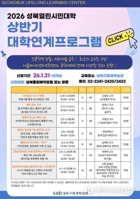 케이시사타임즈 관리자 기자 | 서울 성북구가 2월부터 5월까지 구민을 대상으로 ‘2026 상반기 열린시민대학’을 운영한다.