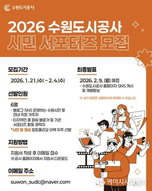 케이시사타임즈 관리자 기자 | 수원도시공사가 21일부터 다음 달 4일까지 2026년도 제8기 시민 서포터즈를 모집한다.
