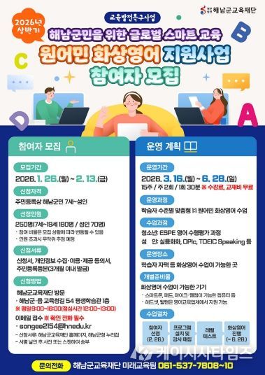 케이시사타임즈 관리자 기자 | 재단법인 해남군교육재단(이사장 명현관)은 상반기 원어민 화상영어 지원사업의 참여자를 모집한다. 지난 2023년부터 시작된 원어민 화상영어 지원사업은 군민 누구나 양질의 영어 교육을 받을 수 있도록 해 지역 내 교육 불균형을 해소하고, 미래 글로벌 인재 양성에 기여하기 위해 운영되고 있다.