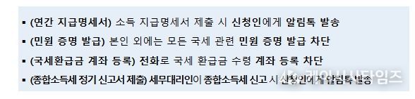 이 밖에도 명의도용으로 인한 피해가 예상되는 국세행정 업무에 대해 다음과 같은 서비스를 시행한다.