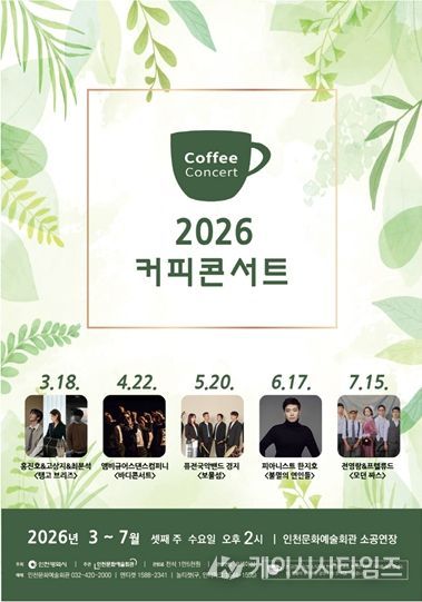 (케이시사타임즈) 인천문화예술회관(관장 홍순미)이 간판 브랜드 공연 〈커피콘서트'의 2026년 상반기 출연진을 공개한다.