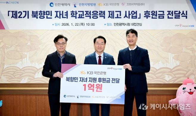 (케이시사타임즈) 인천광역시는 북향민 자녀의 학교 적응력 향상을 위한 '북향민 자녀 학교적응력 제고 제2기 사업' 추진을 위해 1월 22일 후원금 전달식을 개최하고, 국민은행으로부터 후원금 1억 원을 전달받았다고 밝혔다.