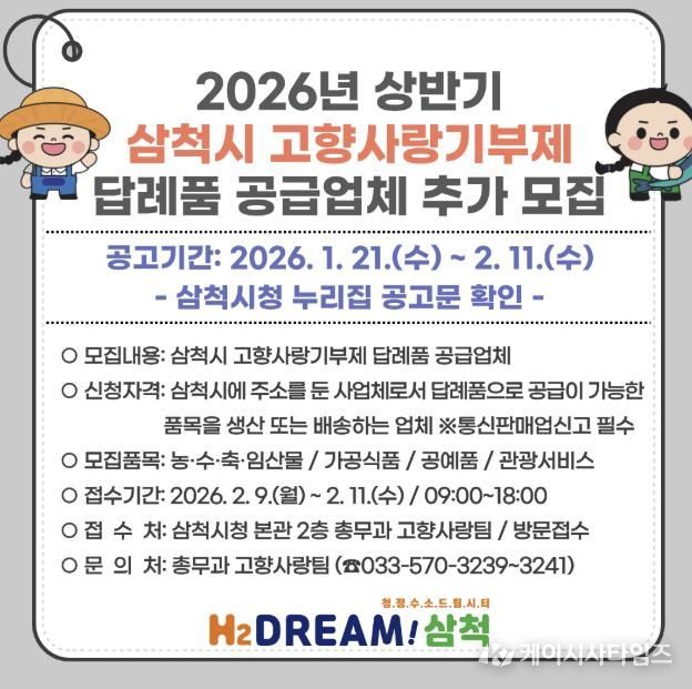 공급업체 선정은 서류심사와 필요시 현장평가를 거쳐 답례품선정위원회에서 최종 심의·결정하며, 결과는 2월 말 삼척시 누리집 공고와 함께 개별 통보할 예정이다.