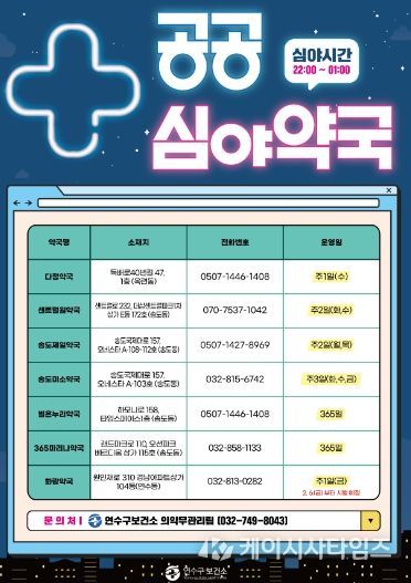 연수구 관계자는 “공공심야약국은 야간 시간대 구민 건강을 지키는 지역 의료안전망”이라며 “앞으로도 주민들이 필요할 때 언제든지 도움받을 수 있도록 안정적인 운영에 힘쓰겠다.”라고 밝혔다.
