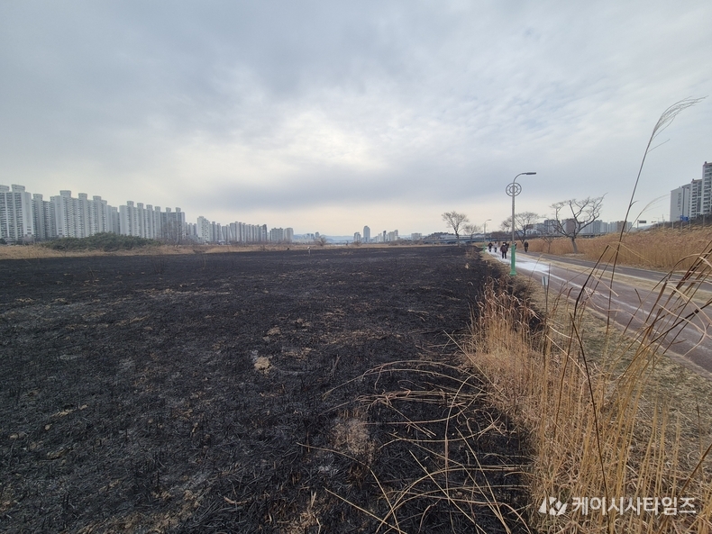 (울산=케이시사타임즈) 김교환 기자=지난 24일 한 50대 남성의 방화로 인해 울산 북구 태화강 물억새 군락지가 불에 탔다. 이곳은 평소에도 울산 시민들이 자주 찾는 명소다. 불에 탄 면적은 3.5ha 정도로 축구장 5개 면적이다. 억새밭 아래로 고압 가스관과 송유관이 지나고 있어 자칫 큰 피해로 이어질 뻔했지만 다행히 인명피해는 발생하지 않았다.