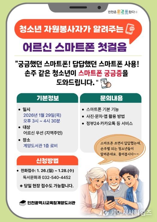 (케이시사타임즈) 인천광역시교육청계양도서관은 오는 29일 1층 로비에서 ‘어르신 스마트폰 첫걸음’행사를 운영한다.