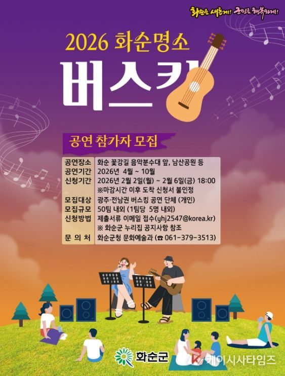 (케이시사타임즈) 화순군은 29일 지역 관광 활성화와 일상 속 문화 향유 기회 확대를 위해 ‘2026 화순 명소 버스킹’에 참여할 공연자를 공개모집 한다고 밝혔다.
