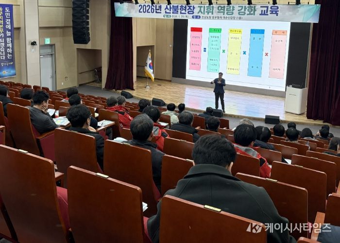 전남도는 29일 동부지역본부 이순신 강당에서 22개 시군 산림부서장과 담당 팀장 등 60여 명을 대상으로 산림청 주관 ‘2026년 산불현장 지휘 역량강화 교육’을 했다.
