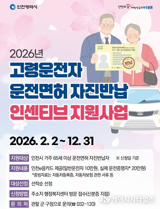 (케이시사타임즈) 인천광역시는 고령운전자의 교통사고 예방과 안전한 교통환경 조성을 위해 고령자 운전면허 자진반납 제도 장려금을 2026년부터 최대 20만 원까지 확대해 시행한다고 밝혔다.