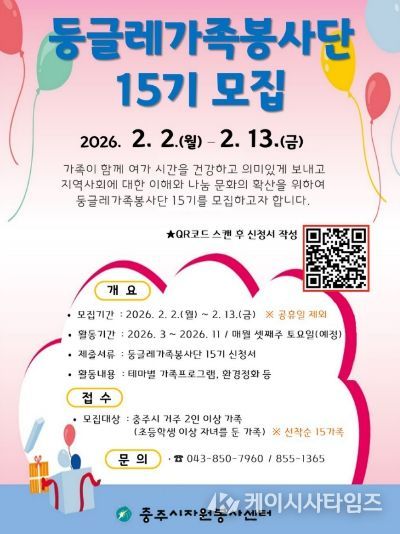 (케이시사타임즈) 충주시자원봉사센터(센터장 심영자)는 관내에 거주하는 초등학생 이상 자녀를 둔 2인 이상 가족을 대상으로 15기 둥글레가족봉사단으로 활동할 15가족을 선착순 모집한다.