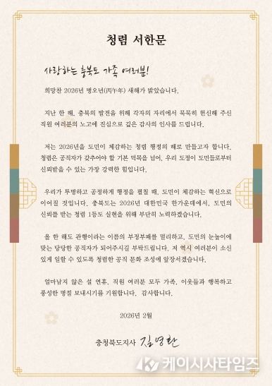 (케이시사타임즈) 김영환 충북도지사가 2026년 병오년(丙午年)을 ‘도민이 체감하는 청렴 행정의 해’로 만들겠다는 의지를 담은 청렴서한문을 전 직원에게 발송하고, 올 한 해 청렴 실천을 당부했다.
