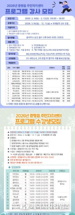 (케이시사타임즈) 충북 증평군 증평읍 주민자치센터가 오는 2월 9일부터 13일까지 5일간 2026년도 주민자치센터 프로그램 수강생과 강사를 모집한다.