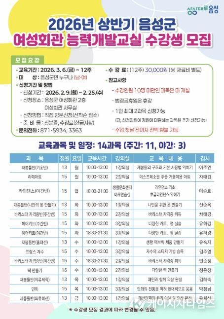 (케이시사타임즈) 음성군은 2026년 상반기 여성회관 능력개발교실 수강생을 모집한다.