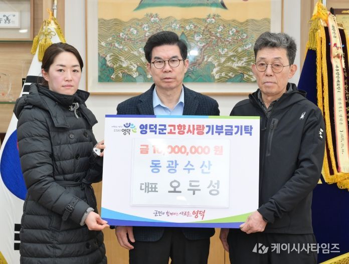 (케이시사타임즈) 영덕군에서 오징어 원물 가공을 주력으로 운영하는 동광수산의 오두성 대표가 지역사회 발전에 이바지하기 위해 지난 2일 김광열 영덕군수를 만나 고향사랑기부금 1,000만 원을 전달했다.