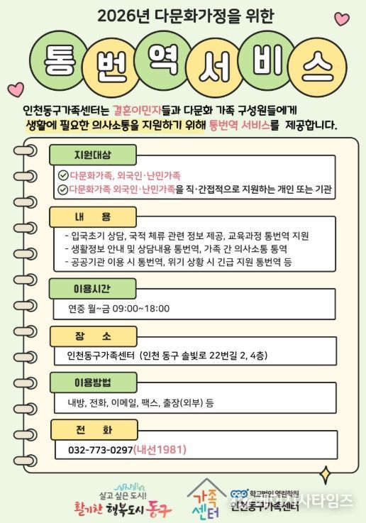 (케이시사타임즈) 인천동구가족센터는 결혼이민자의 언어 장벽을 해소하고 안정적인 한국 사회 정착을 돕기 위해 ‘결혼이민자 통·번역 무료서비스’를 운영한다고 밝혔다.