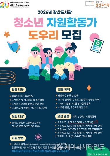 (케이시사타임즈) 부평구립 갈산도서관은 오는 27일까지 청소년 자원활동가 ‘도우리’를 모집한다고 밝혔다.
