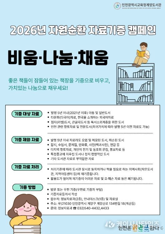 (케이시사타임즈) 인천광역시교육청계양도서관은 시민과 지역사회가 함께하는 자원순환형 독서문화 확산을 위해 2026년 자료기증 캠페인 ‘비움·나눔·채움’을 연중 운영한다고 5일 밝혔다.
