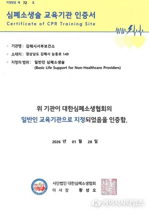 (케이시사타임즈) 김해시는 김해시서부보건소가 대한심폐소생협회(KACPR)로부터 ‘일반인 심폐소생술 교육기관(TS)’으로 공식 지정됐다고 6일 밝혔다.