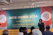 뉴미디어타임즈 배건 기자 | 1월 17일부터 22일까지, 서울 종로구 인사동에 위치한 갤러리라메르(1관)에서 아트힐아트페어2024 부스공모전이 개최된다. 개막식 진행은 김미정 기획운영위원장의 사회로 시작되었다. 축하공연으로 바이올린 연주와 왈츠 춤에 이어서 소리꾼의 배띄워라, 난감하네 노래가 신나게 불려지면서 분위기가 달아오른 가운데, 내외빈소개, 황정희 대회장과 배건 조직위원장 인사말에 이어 이종환 상미술회 회장, 황순규 한국녹색미술협회 회장, 양태석 사)국전작가협회 이사장, 허필호 사) 한국전통공예예술협회 이사장의 축사가 이어지고, 참여작가들의 소개와 단체 기념촬영, 작가들의 부스를 관람하는 순으로 이어졌다. 개막식에는 배윤섭 사) 한국휴먼교육문화협회 이사장, 사)국제현대예술협회 김용모 이사장, 고완석 G아트 대표, 여운미 세계미술작가교류협회 회장, 박호식 경기고양신문 발행인 등 200여명의 미술인, 작가와 관람객들이 참석하였다. 아트힐아트페어2024는 남기희 대표와 배건 조직위원장, 김미정 기획운영위원장이 작가들에게 헌신하는 마음으로 기획하였으며, 작가 스스로가 기발한 아이디어를 내서 자신의 작품성이 더 빛날 수 있도록 부스를 자율적으로 꾸미게 하여,