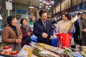 (케이시사타임즈) 이재명 대통령과 김혜경 여사는 오늘 낮, 설 명절을 앞두고 충북 충주시에 위치한 무학시장을 찾아 지역 세밑 물가를 점검하고 상인들을 만나 현장 의견을 청취했다. 무학시장은 지난 1978년 노점상들의 정착을 위해 개설된 전통시장이며, 이번 방문은 설 민심을 청취하기 위한 민생 행보의 일환이다. 이 대통령과 김 여사는 시장 내 여러 상점을 들러 “새해 복 많이 받으세요”라며 인사를 했고, 상인과 시민들은 환호와 박수로 이 대통령 부부를 맞았다. 이 대통령 부부에게 더덕을 판매한 상인은 “덕분에 마수걸이를 한다”며 “오늘 장사가 잘될 것 같다”고 말해 웃음을 자아냈다. 다른 상인들도 “힘나게 해주셔서 감사하다”, “너무 고생 많으시다”며 인사를 전했다. 이 대통령 부부는 황태포, 시금치, 곶감과 깐밤 등 제수용품과 먹거리를 구입했고 백도라지, 마른 멸치, 배추전 등을 즉석에서 맛보기도 했다. 이 대통령 부부는 온누리상품권과 현금으로 결제했다. 김 여사가 물건을 고르는 사이 이 대통령은 상인들에게 “장사는 잘 되느냐”, “곧 설인데 어떠시냐”고 물었다. 정육점 사장은 “대목